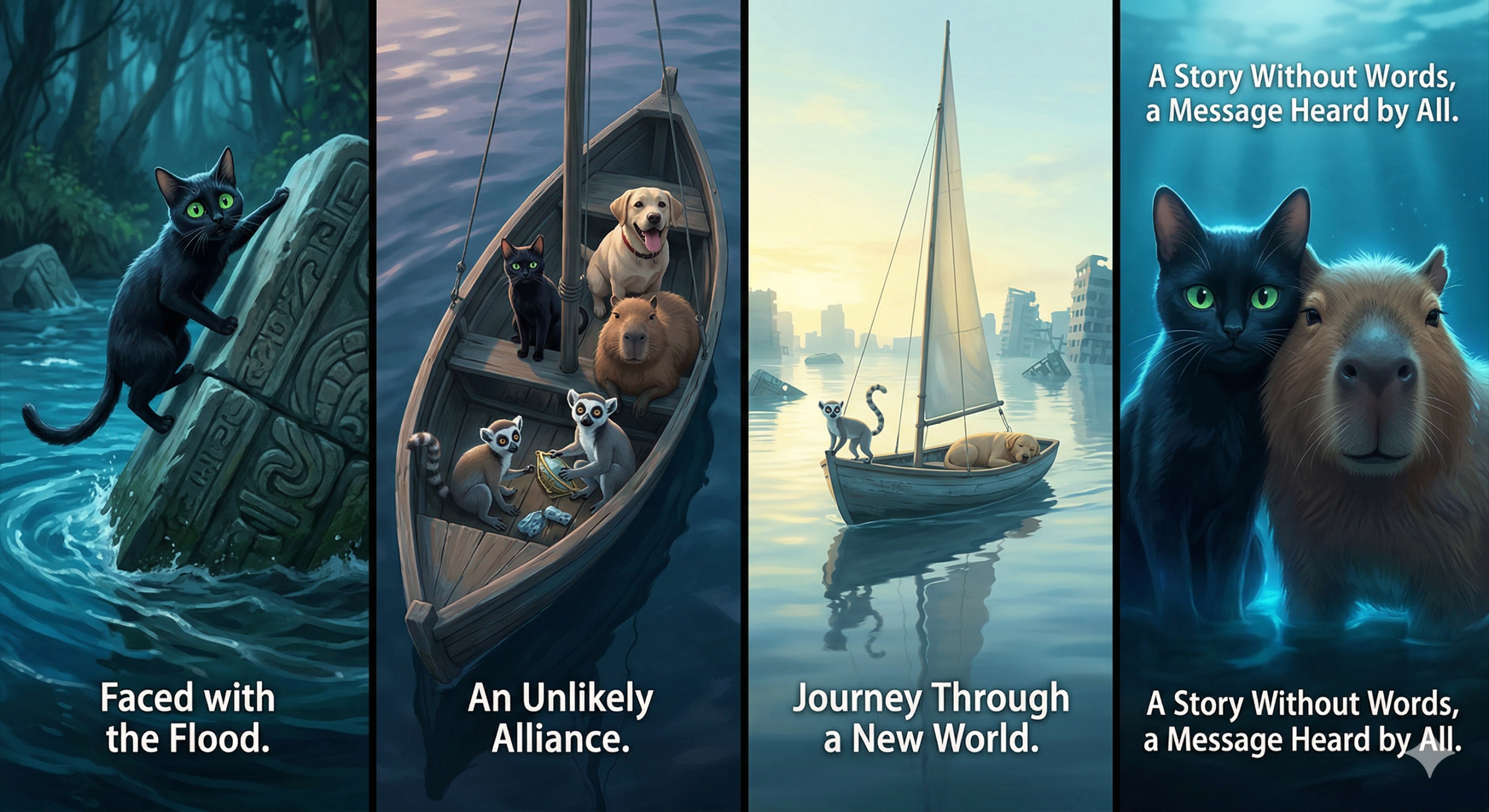 When a catastrophic flood begins to swallow the landscape, the Cat is forced to abandon its solitary life. It finds refuge on a small, drifting sailboat, but it isn’t alone. The vessel becomes a literal “Noah’s Ark” for a motley crew of survivors: